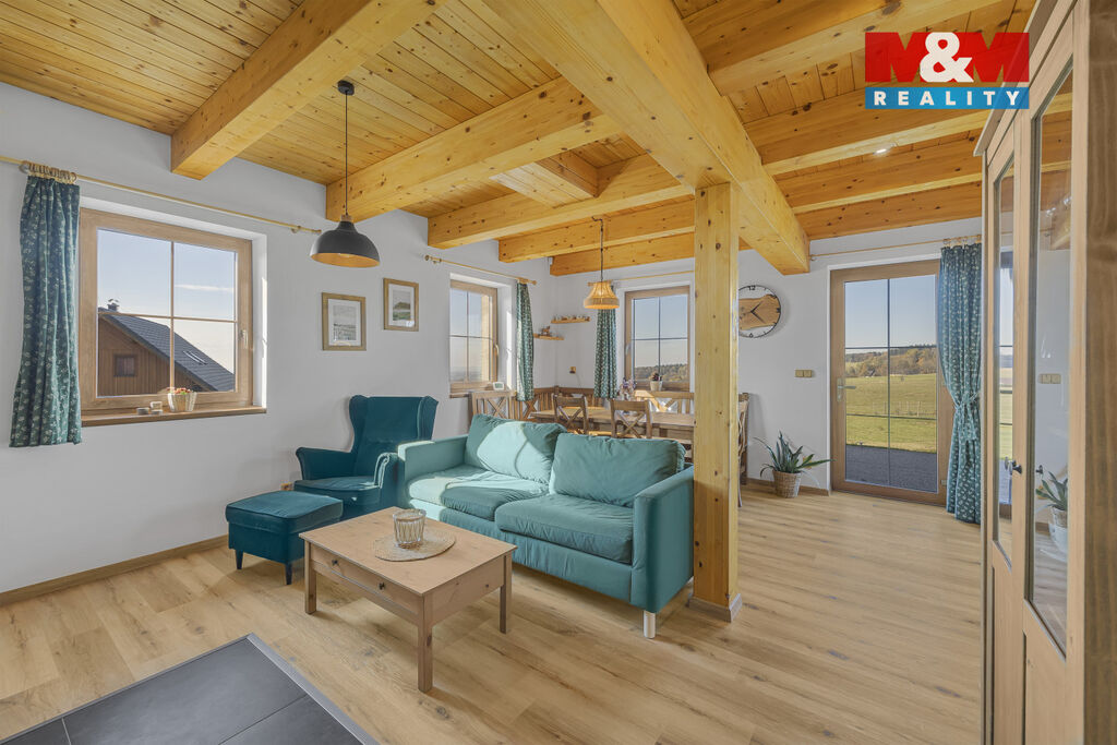 Nabízíme k prodeji stylovou horskou chalupu kolaudovanou jako rodinný dům o dispozici 5+kk, situovanou v klidné části obce Bělá u Liberka. Dům o užitné ploše 142 m² je novostavbou se dvěma nadzemními podlažími. Na pozemku o rozloze 3835 m² naleznete zpevněné parkování a dostatek prostoru pro odpočinek. V domě jsou dvě koupelny, jedna s vanou a druhá se sprchovým koutem. Podlahy jsou vinylové s podlahovým vytápěním, které je zajištěno tepelným čerpadlem a kachlovými kamny s výměníkem. Nemovitost je vybavena moderní kuchyňskou linkou se všemi spotřebiči. Technická místnost je vybavena akumulační nádrží, elektrický bojlerem a úpravnu pitné vody. Voda je zajištěna z vrtné studny, odpadní vody jsou řešeny biologickou čistírnou. Okna plastová s trojskly a sítěmi proti hmyzu. Dům je kompletně zateplený a čeká na finální nátěr fasády podle vkusu nového majitele. Ski areály Říčky a Zdobnice vzdálené 16 minut autem. Více informací u makléře.