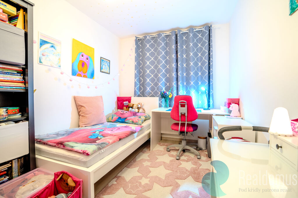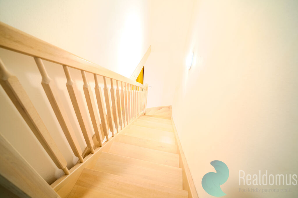 V patře se nachází chodba, koupelna s WC, ložnice a dětský pokoj, které nabízejí dostatek prostoru pro pohodlné rodinné bydlení.