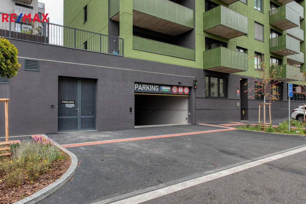 Vstup na lodžii o velikosti 3,4 m² je možný jak z ložnice, tak z obývacího pokoje. K bytu náleží sklepní kóje (4,6 m²) a garážové parkovací stání.