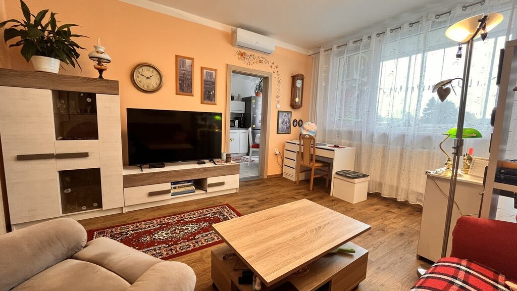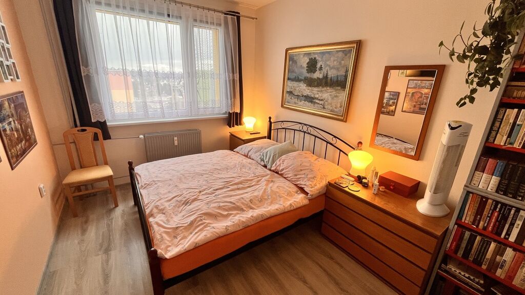 Samotný byt vás uvítá prostornou chodbou, ze které se dostanete do dalších částí bytu. První pokoj vlevo má cca 16 m2 užitné plochy a nyní slouží jako pokoj pro hosty. V zadní části po levé straně nalezneme ložnici s plochou přes 11 m2. Zděná koupelna s toaletou je na konci chodby vpravo. Obývací pokoj má rozlohu přes 19 m2 a nabízí dostatek prostoru k relaxaci stejně jako zasklená lodžie vedle něj. Tam si můžete vychutnat například ranní kávu. Sousedící kuchyň má bohatě dostačujících 14 m2. Celý prostor působí velmi vzdušně, svěže s dostatkem světla. Kompletní rekonstrukce bytu proběhla před 3 lety, jsou zde použity kvalitní materiály a je to na bytě rozhodně znát. V obývacím pokoji a ložnici je klimatizace, který umí i topit.