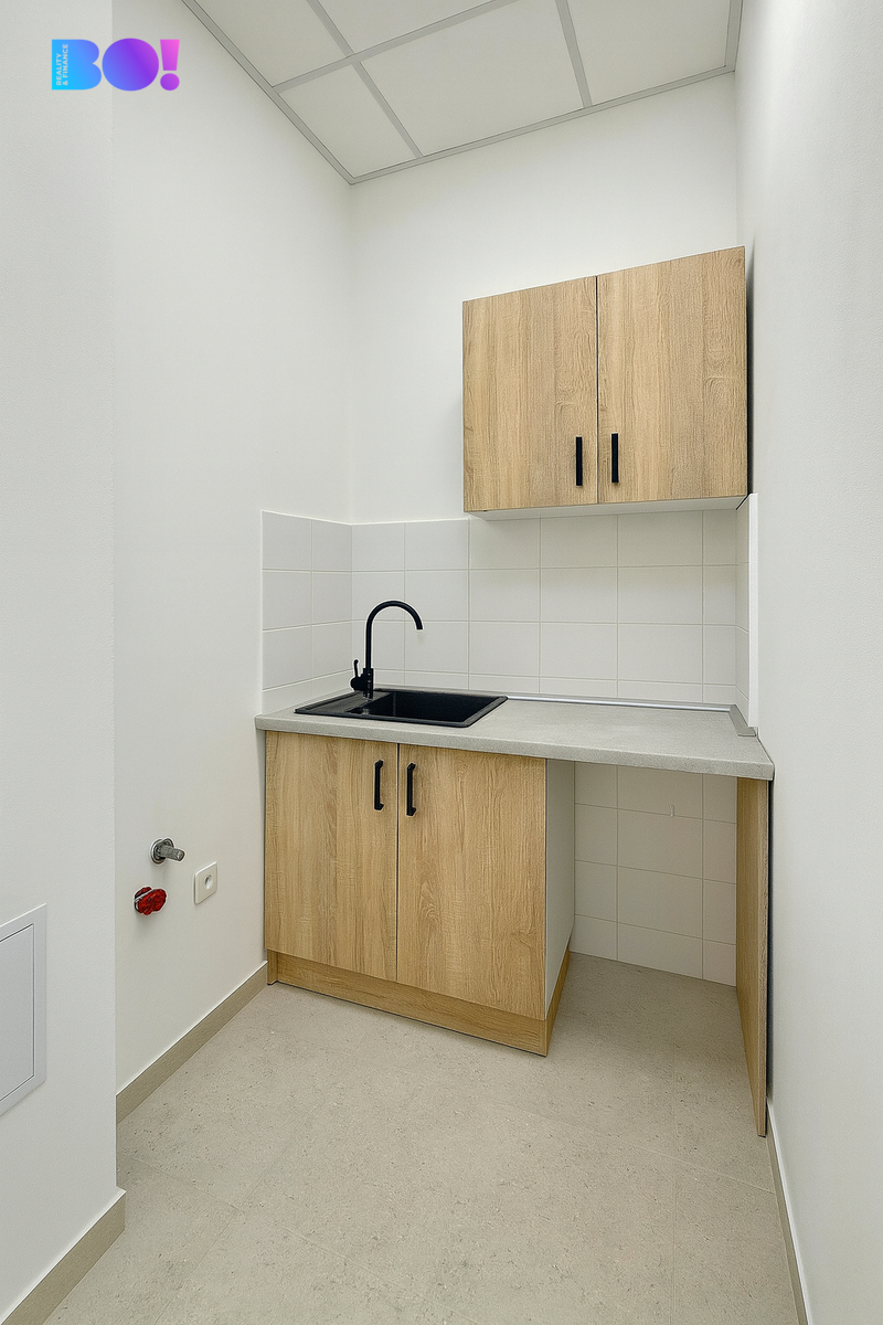 Kancelář je situovaná v klidné části administrativní budovy s výbornou dostupností, pár kroků od hlavní třídy a všech služeb. Interiér je laděn do čistého, moderního stylu – keramická dlažba, podhledové osvětlení, velká okna s vertikálními žaluziemi a decentní barevnost vytvářejí profesionální, ale zároveň příjemné pracovní prostředí.