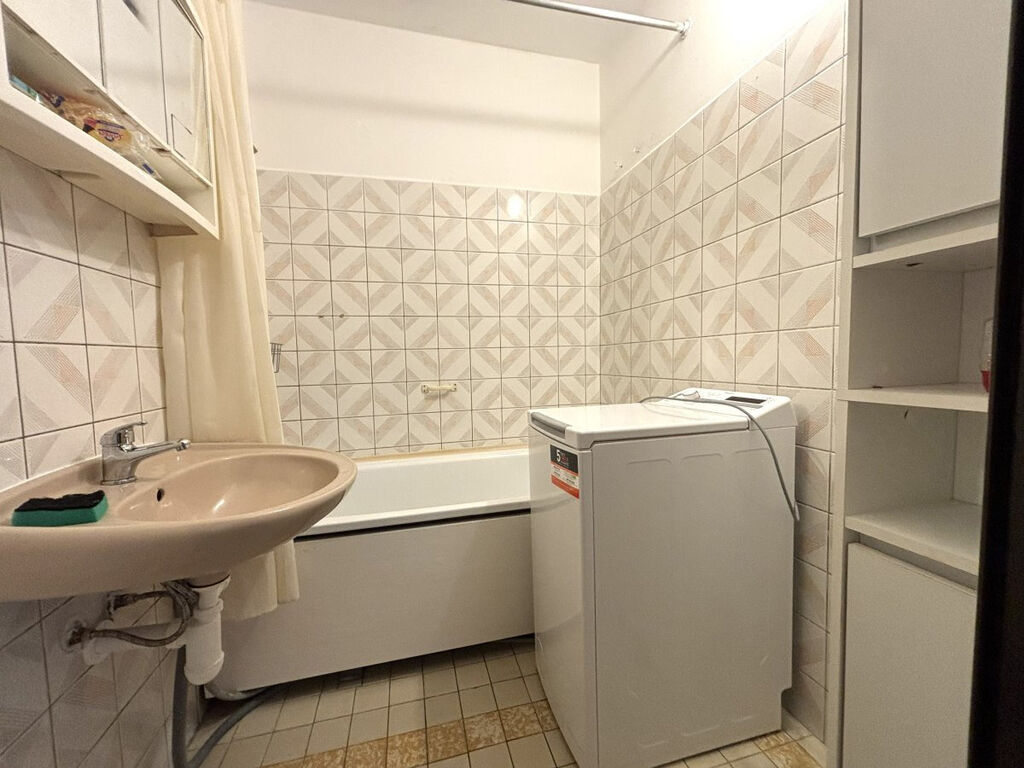 Koupelna je potom zařízena vanou, koupelnovou skříňkou, galerkou a pračkou.