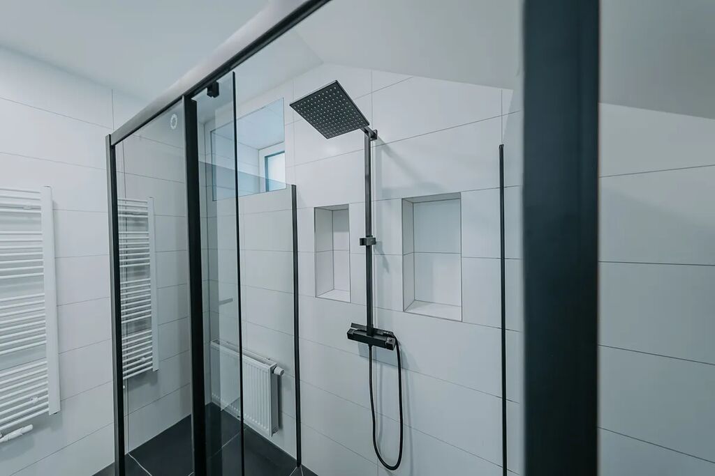 • Koupelny s černými bateriemi a podlahovým vytápěním