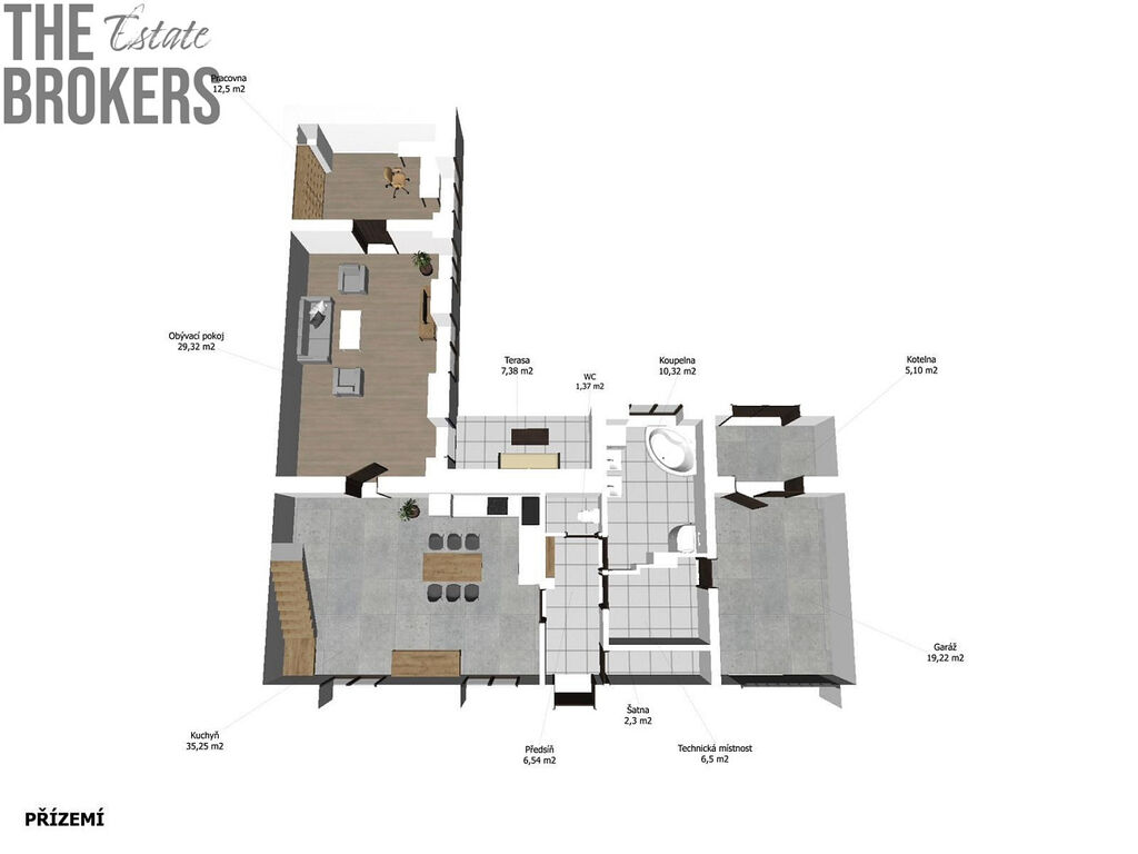 V přízemí domu lze vybudovat moderní kuchyň s jídelnou, obývací pokoj s krbovými kamny, koupelnu, pracovnu či ložnici, technickou místnost a vstup do garáže.
