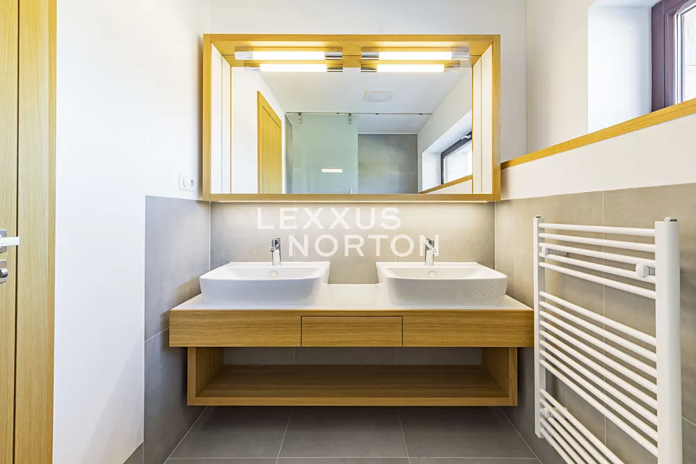 K prodeji nabízíme výjimečnou rodinnou řadovou vilu 6+kk s celkovou podlahovou plochou 405 m² a třemi parkovacími stáními v podzemních garážích. Tento promyšleně navržený dům je ideální pro rodiny hledající maximální komfort a flexibilitu prostoru. Přízemí domu nabízí velkorysý obývací prostor s přípravou pro kuchyňský kout (70,6 m²) s přímým výstupem na terasu s výhledem do kaskádovité zahrady. V přízemí je dále k dispozici pokoj pro hosty s vlastní koupelnou, který může sloužit také jako pracovna a další samostatná koupelna s toaletou. První patro disponuje hlavní ložnicí 18,5 m² s vlastní koupelnou a prostornou šatnou, 2 prostornými ložnicemi (18,4 m² a 19,6 m²) s vlastními koupelnami a další samostatnou šatnou. Korunou domu je krásná střešní terasa 84 m² s výhledy do okolní zástavby a zeleně, kterou lze při zastřešení využívat téměř celoročně.