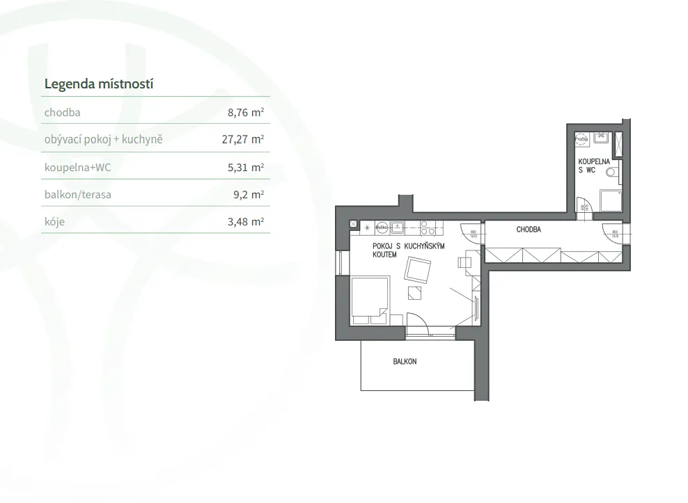 Nabízíme nový byt 1+kk o podlahové ploše 41,34 m², ke kterému náleží:
