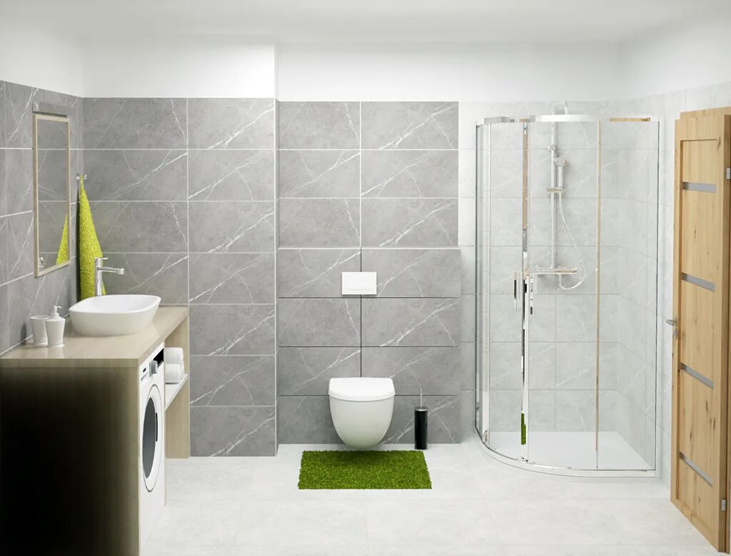 Moderní podlahové krytiny, keramické obklady do výšky dveří.