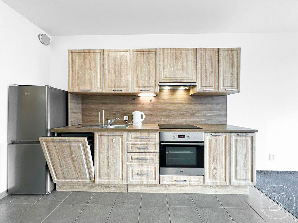 Byt bude zařízený. Zahrnuje jeden samostatný neprůchozí pokoj a obývací pokoj s kuchyňskou linkou, která je vybavena spotřebiči (vestavná trouba, sklokeramická indukční deska, lednice a myčka na nádobí). V koupelně je sprchový kout a WC.