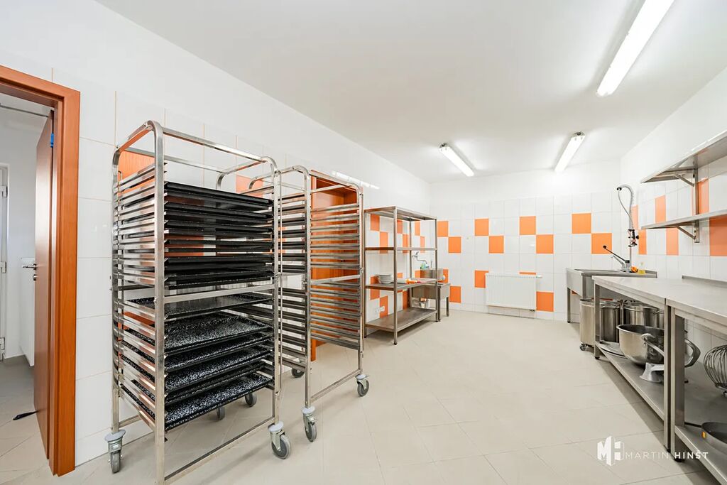 Nabízíme Vám pronájem kompletně vybaveného výrobního prostoru zkolaudovaného jako pekárna v obci Zlonín. Prostor o ploše 55 m² se nachází v přízemí patrového cihlového domu ve velmi dobrém stavu. Vybavení zahrnuje 4 malé a 1 velký nerezový stůl, 6 velkých a 1 malou nástěnnou nerezovou polici, 2 velké lednice, 1 velký mrazák, 1 plynový konvektomat s odsáváním, 1 velký a 1 malý mixér, 4 pojízdné nerezové stojany s plechy, nerezový dvojdřez a malé dřezy s výlevkami. Součástí je také šatna, WC, velká výlevka. Vytápění a ohřev vody je řešeno plynovým kotlem.