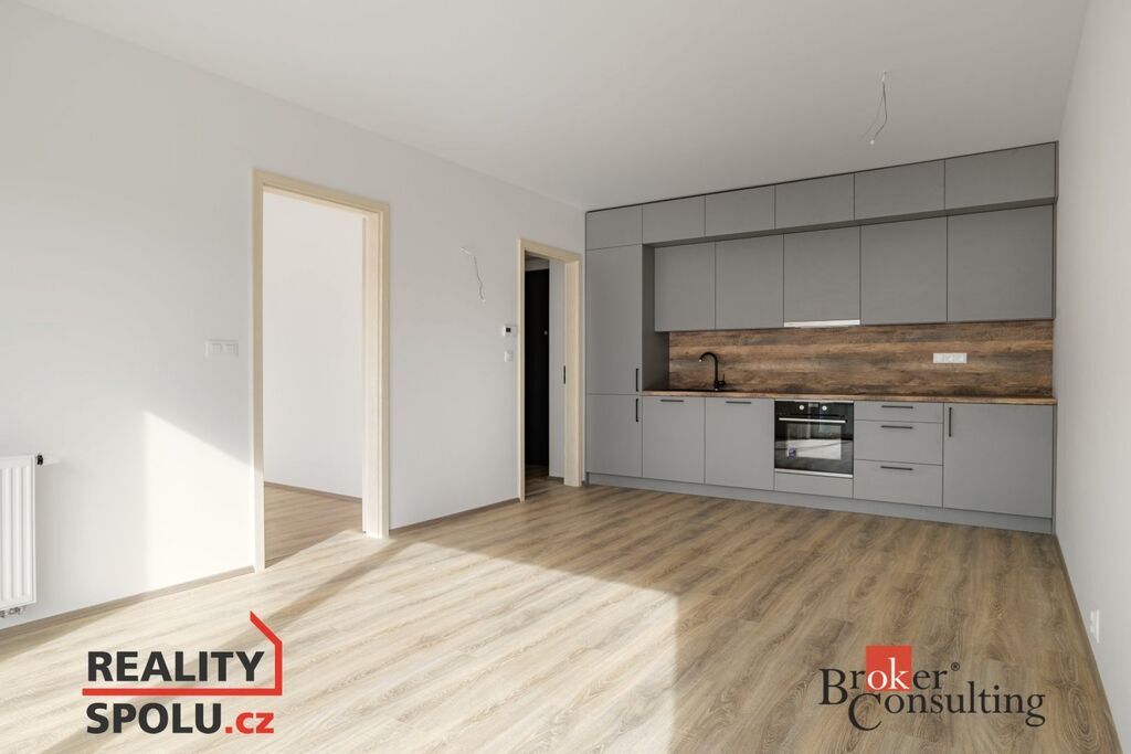 Na levé straně vstoupíte do světlého obývacího pokoje s kuchyňským koutem, který tvoří srdce celého bytu.