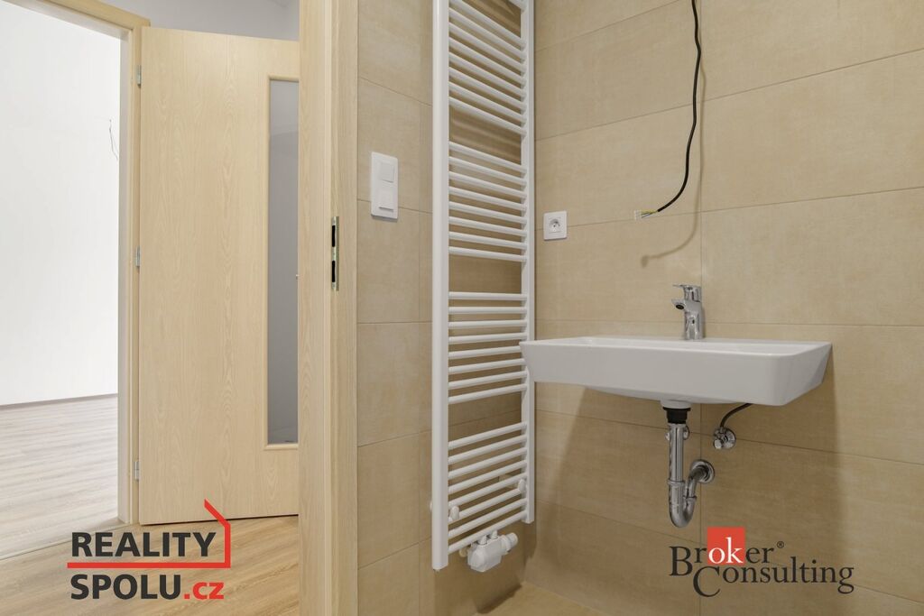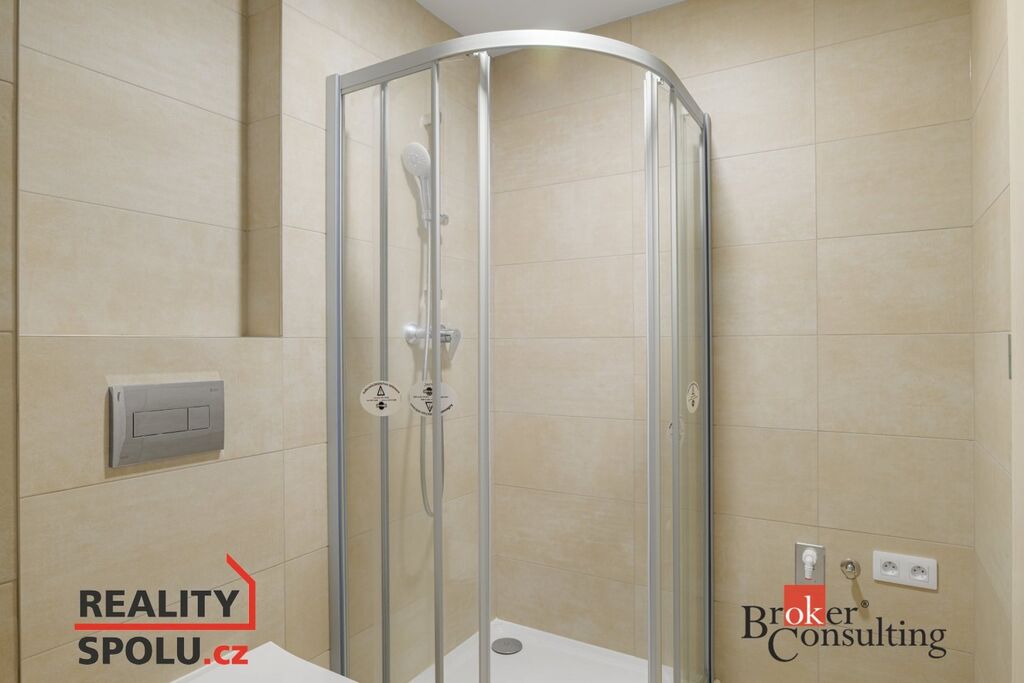Na pravé straně se nachází moderní koupelna se sprchovým koutem, umyvadlem se skříňkou a místem pro pračku.