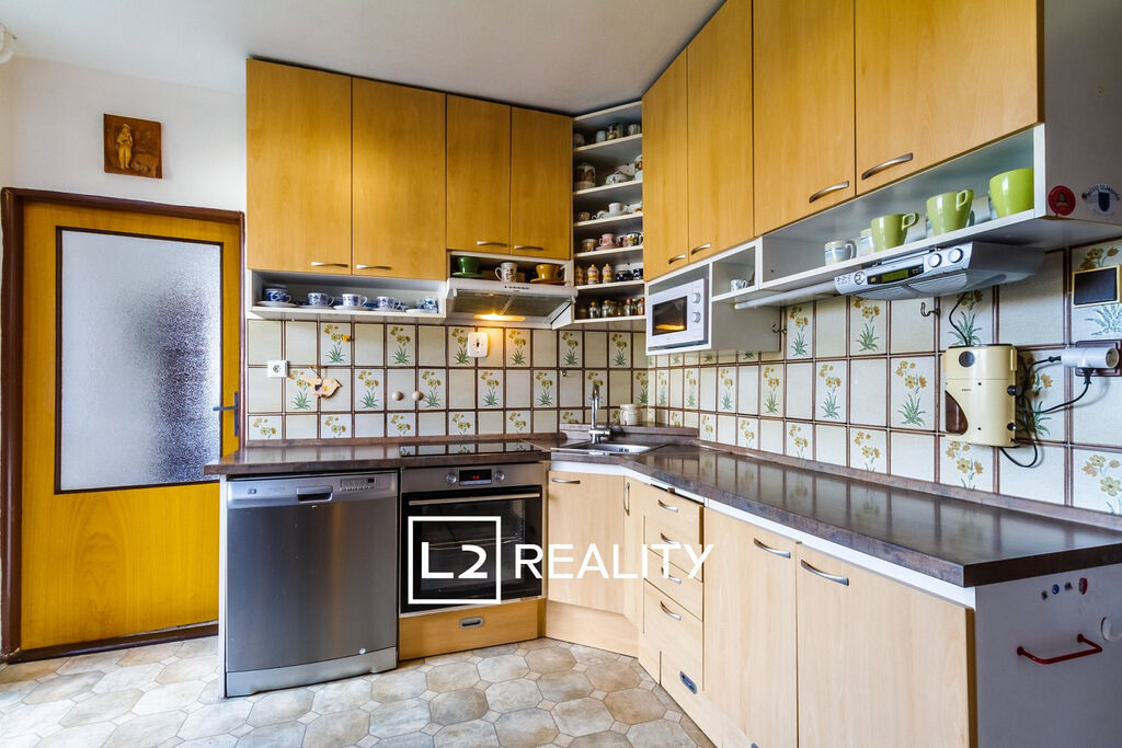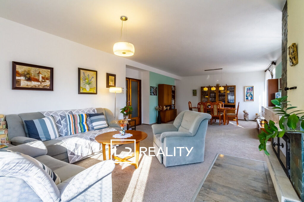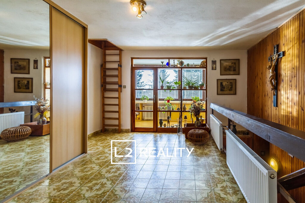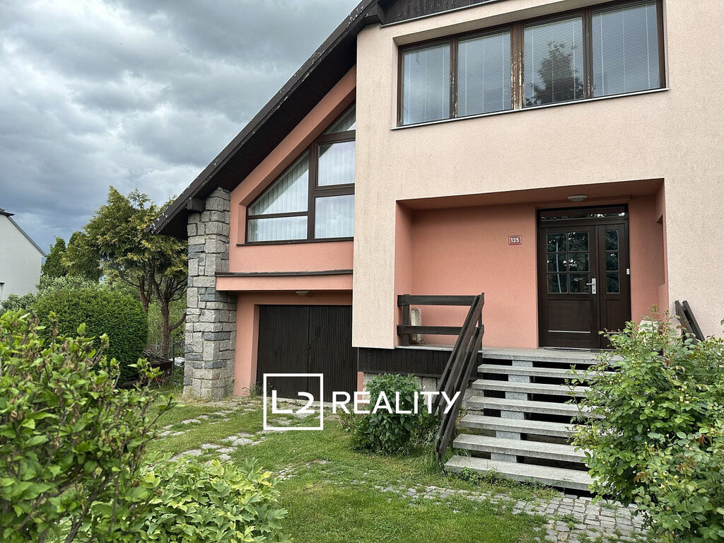 Hlavním prostorem domu je 45 m² velký obývací pokoj s krbem, jídelnou a přímým vstupem na terasu. Kuchyň je plně vybavená a umožňuje vstup do zahrady. V přízemí se dále nachází vstupní hala, samostatná toaleta a zádveří. V patře je prostorná a světlá ložnice se vstupem na balkon, dva dětské pokoje, velká koupelna s vanou a dvěma umyvadly, samostatná toaleta, prostorná hala a zimní zahrada. Dům je celý podsklepený a nabízí technické zázemí i velký skladovací prostor. Je napojen na elektřinu, městský vodovod, splaškovou kanalizaci a plynovod.
