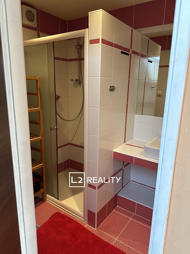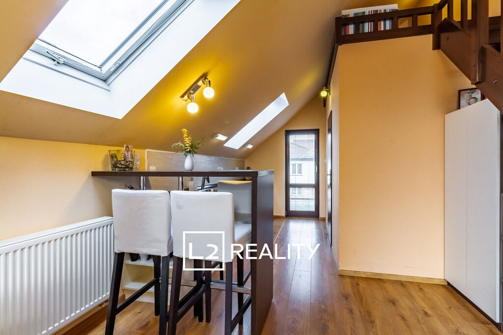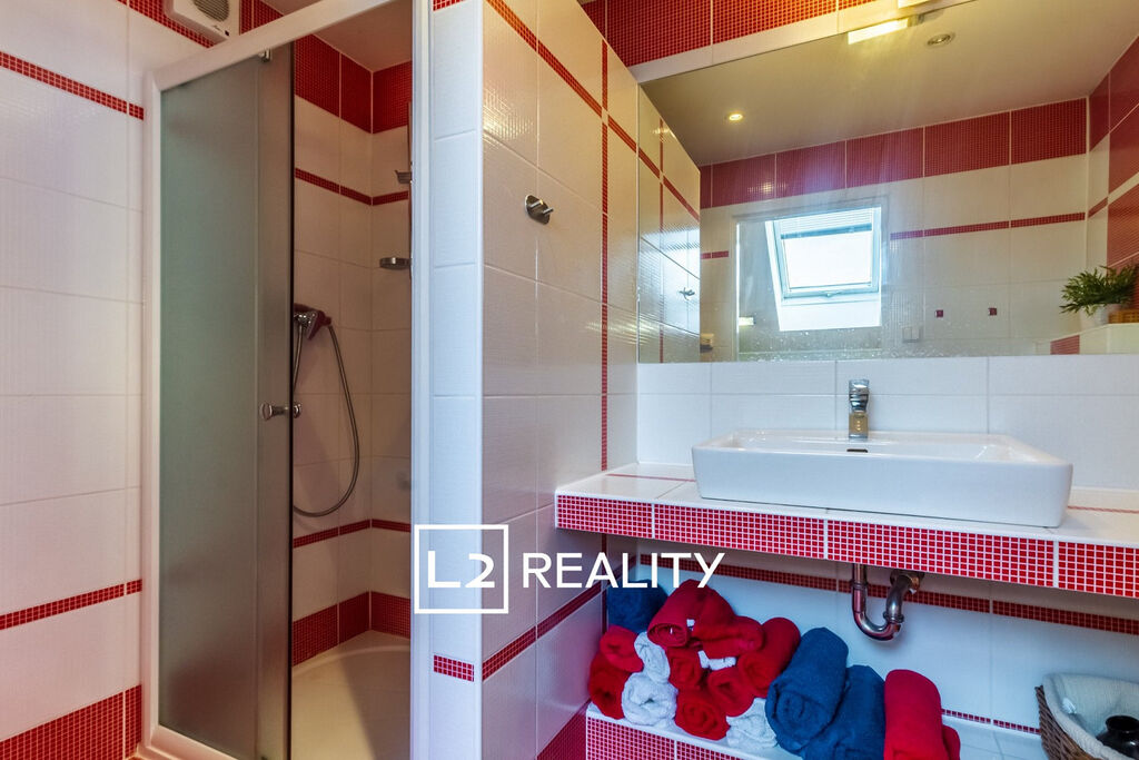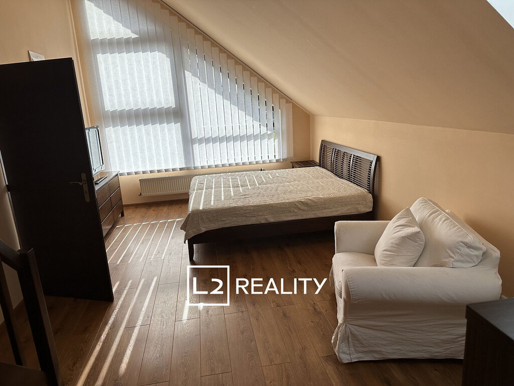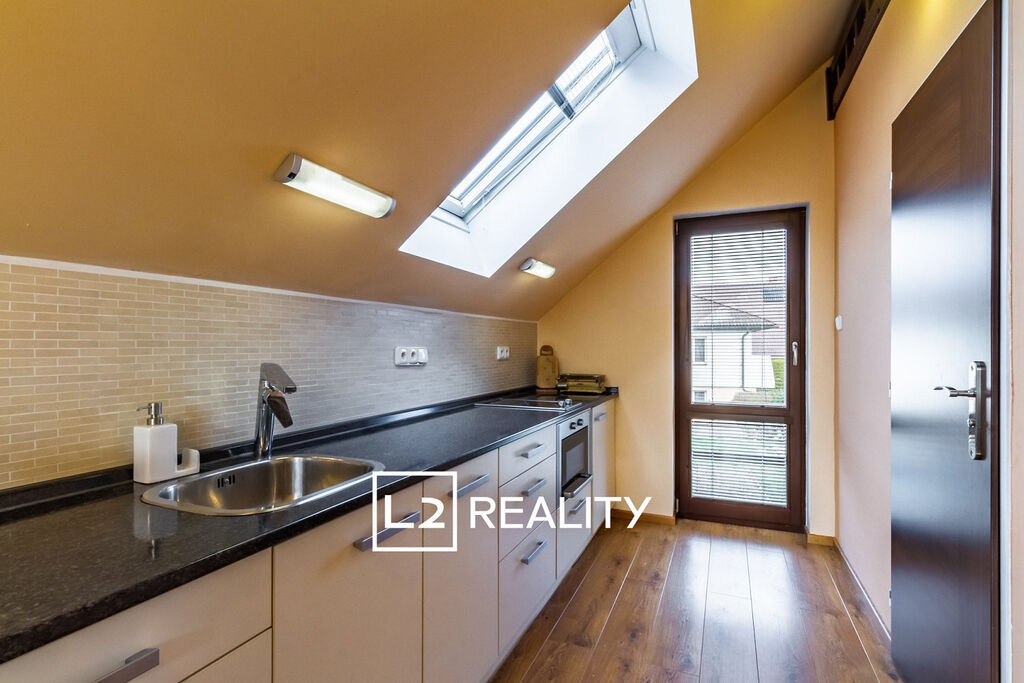 Součástí nemovitosti je také samostatný byt 1+kk o ploše přibližně 30 m², přístupný ze vstupní haly. Tento byt zahrnuje obývací pokoj s kuchyňským koutem, mezonetový prostor na spaní a koupelnu se sprchovým koutem a toaletou.