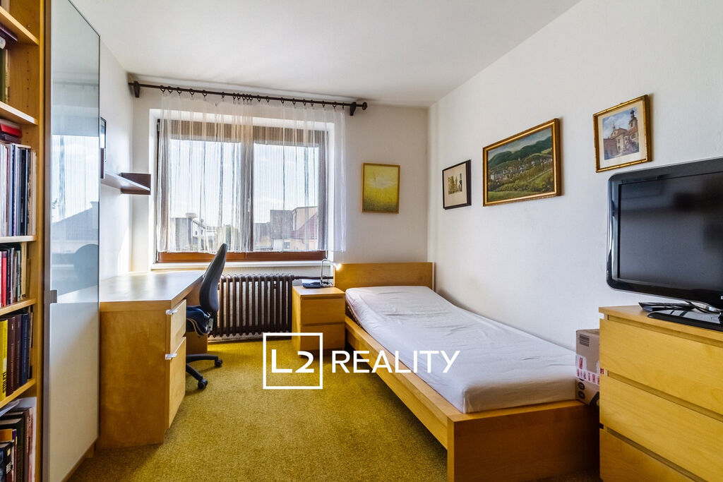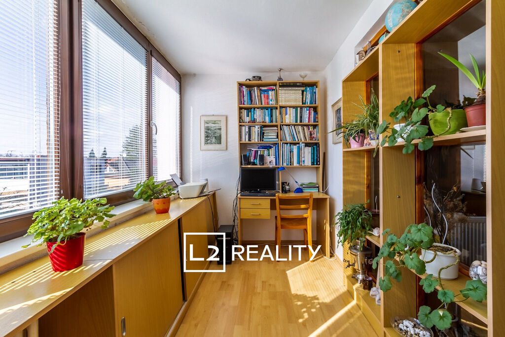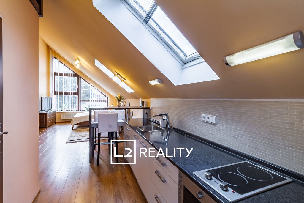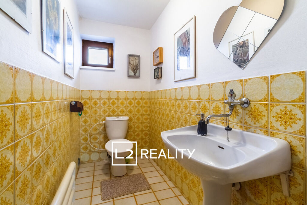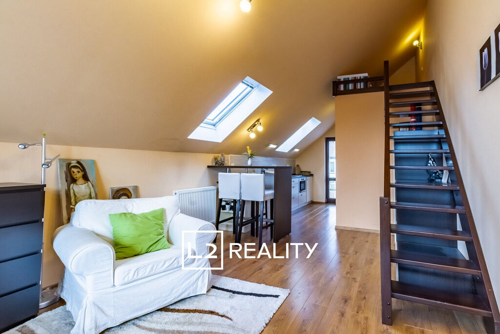 Součástí nemovitosti je také samostatný byt 1+kk o ploše přibližně 30 m², přístupný ze vstupní haly. Tento byt zahrnuje obývací pokoj s kuchyňským koutem, mezonetový prostor na spaní a koupelnu se sprchovým koutem a toaletou.