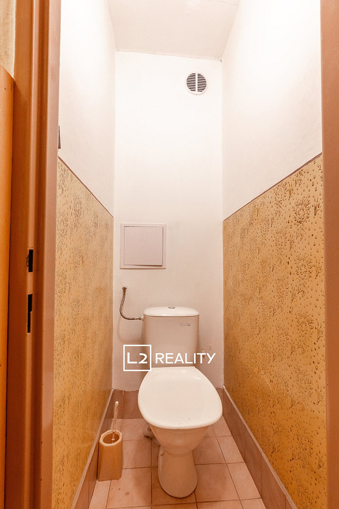 Interiér tvoří obývací pokoj propojený s kuchyní vybavenou původní linkou s nerezovým dřezem, prostorem pro sporák a místem pro samostatně stojící lednici s mrazákem, dvě ložnice s vestavěnými skříněmi, koupelnu s vanou a umyvadlem a samostatné WC. Další vestavěné skříně v chodbě i ložnicích nabízejí dostatek úložného prostoru. Podlahy v obytných místnostech pokrývají bukové parkety, v obývacím pokoji a ložnici v současné době kryté kobercem. Ke kuchyni přiléhá lodžie o velikosti 4 m², v přízemí domu je k dispozici prostorná sklepní kóje o velikosti 8 m².