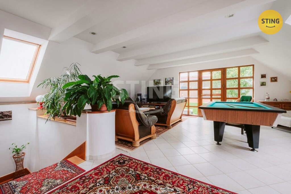 Ve druhém patře se rozprostírá společenská místnost s kulečníkem, barem a přímým vstupem na zahradu s bazénem a zahradním domem, dále čítárna, pracovna, dvě ložnice, šatna a koupelna s rohovou vanou. Dům má také půdu, ideální pro uložení sezónních věcí.
