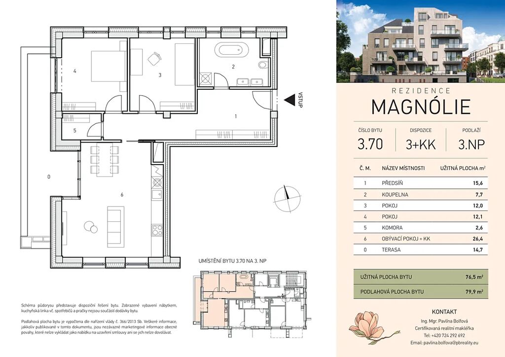 Nabízený byt je na 3. podlaží, bude mít podlahovou plochu 79,9 m2 a terasu o výměře 14,7 m2 orientovanou na západ.
