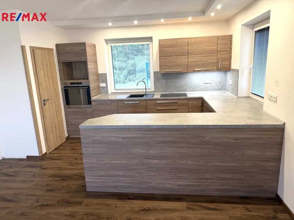 V levé části domu je obývací pokoj se vstupem francouzskými okny na terasu, kuchyňská linka včetně spotřebičů, komora, koupelna s WC, technická místnost.