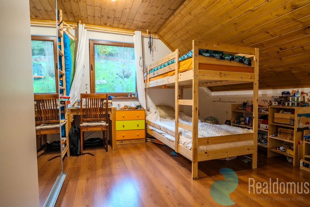 Dispozice 4+kk působí vzdušně a útulně zároveň. Velká okna vpouštějí dovnitř denní světlo a propojují interiér se zahradou, kde rostou ovocné stromy a kde najdete dvě terasy i balkon s výhledem, který se prostě neokouká.