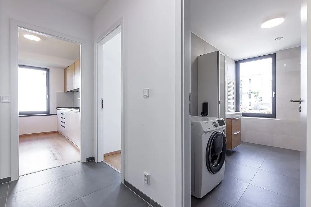 K vysokému standardu vybavení bytu patří kvalitní dřevěné a keramické podlahy, podlahové vytápění v celém bytě, v koupelně doplněno otopným žebříkem, velkoplošná okna s izolačními trojskly, elektricky ovládané předokenní žaluzie, bílé interiérové bezfalcové dveře s nadstandardní výškou 2,1 m, koupelna je vybavena zařizovacími prvky značek Laufen, Grohe, Kaldewei a HÜPPE. Kuchyň je dodána na míru, stejně jako vestavěné skříně. K dispozici je i moderní markýza s osvětlením na el. pohon zakrývající terasu.