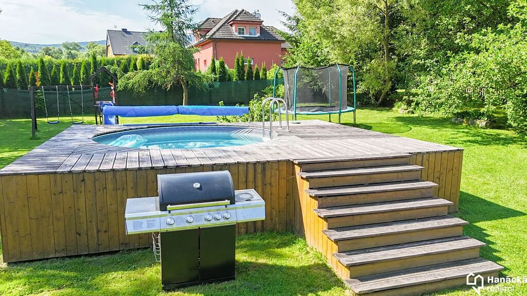 K relaxaci i zábavě slouží venkovní terasa, bazén, dřevěná káď s horkou vodou a dětské hřiště s prolézačkami a trampolínou.