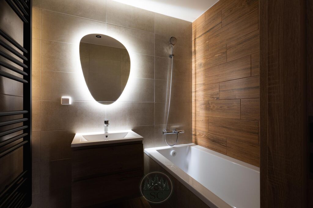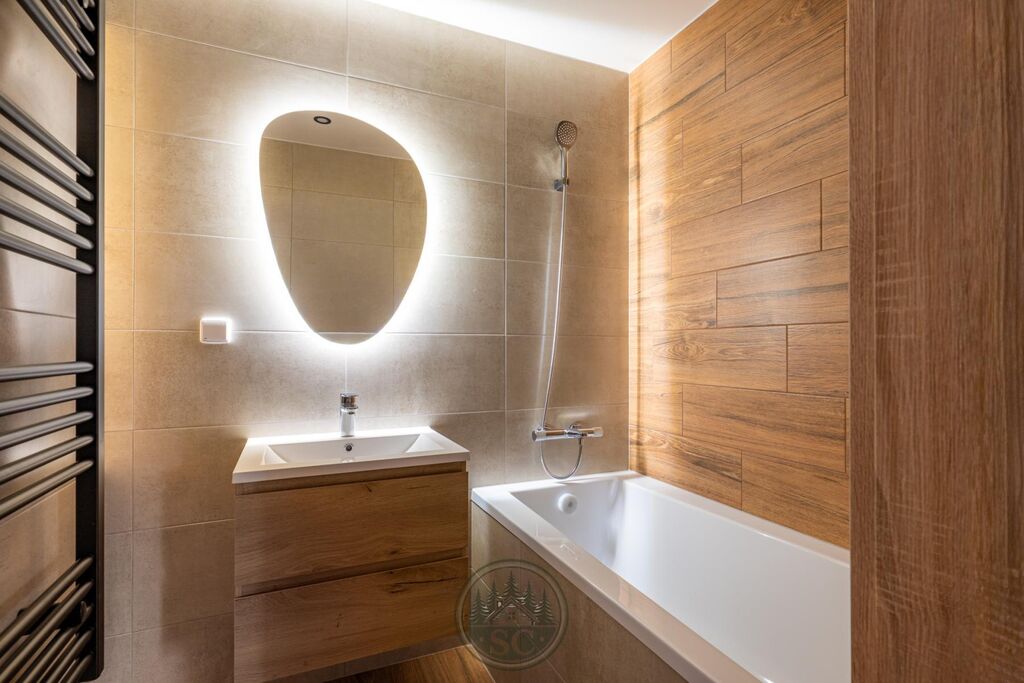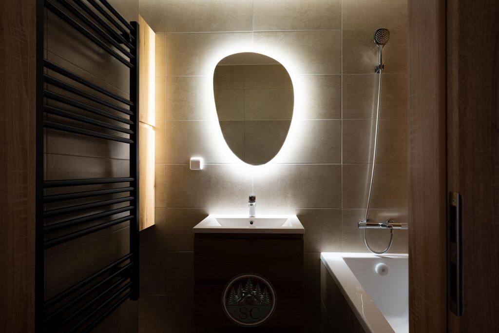 Koupelna působí velmi elegantně, je vybavená umyvadlem se skříňkou a úzkou skříní, které spolu perfektně ladí. Nechybí topný žebřík, vana a svítící zrcadlo.