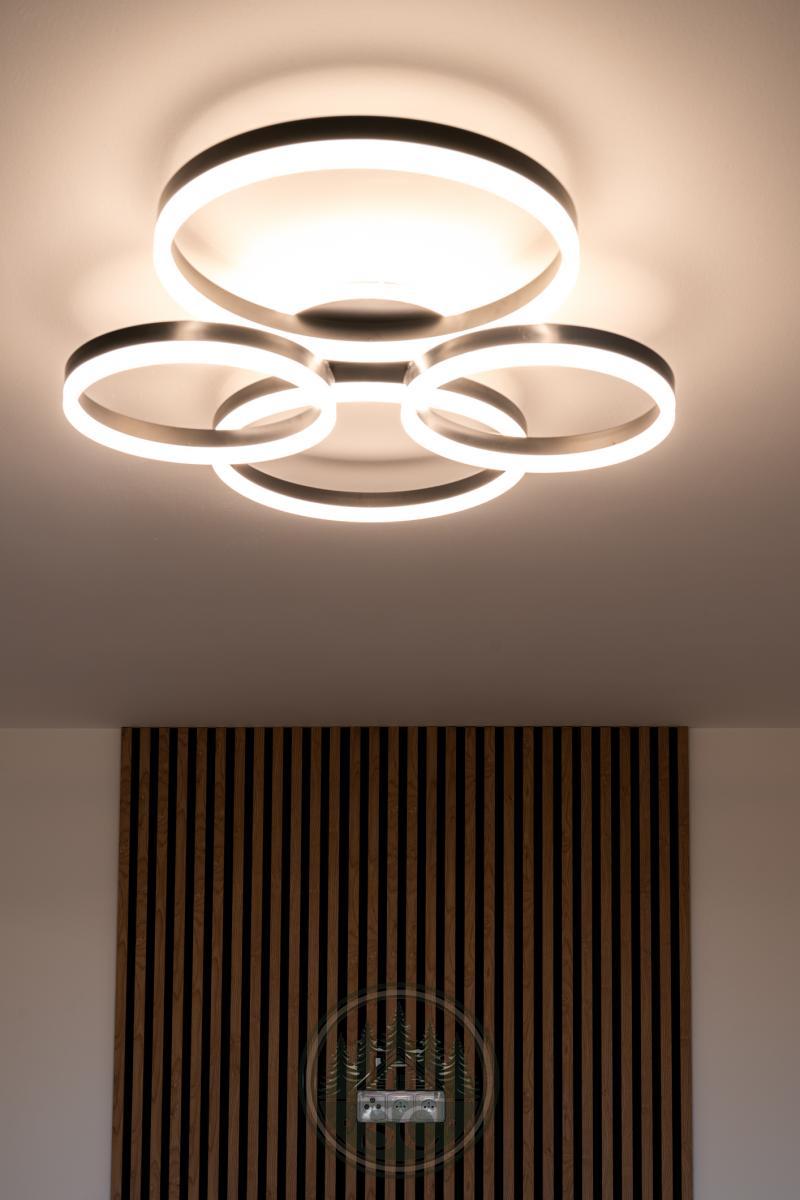 V obývacím pokoji je připravena stěna pro TV  - kabel i zásuvky jsou zabudované přímo ve stěně. Dominantou místnosti je designové světlo s možností přepínat mezi teplým a studeným tónem.