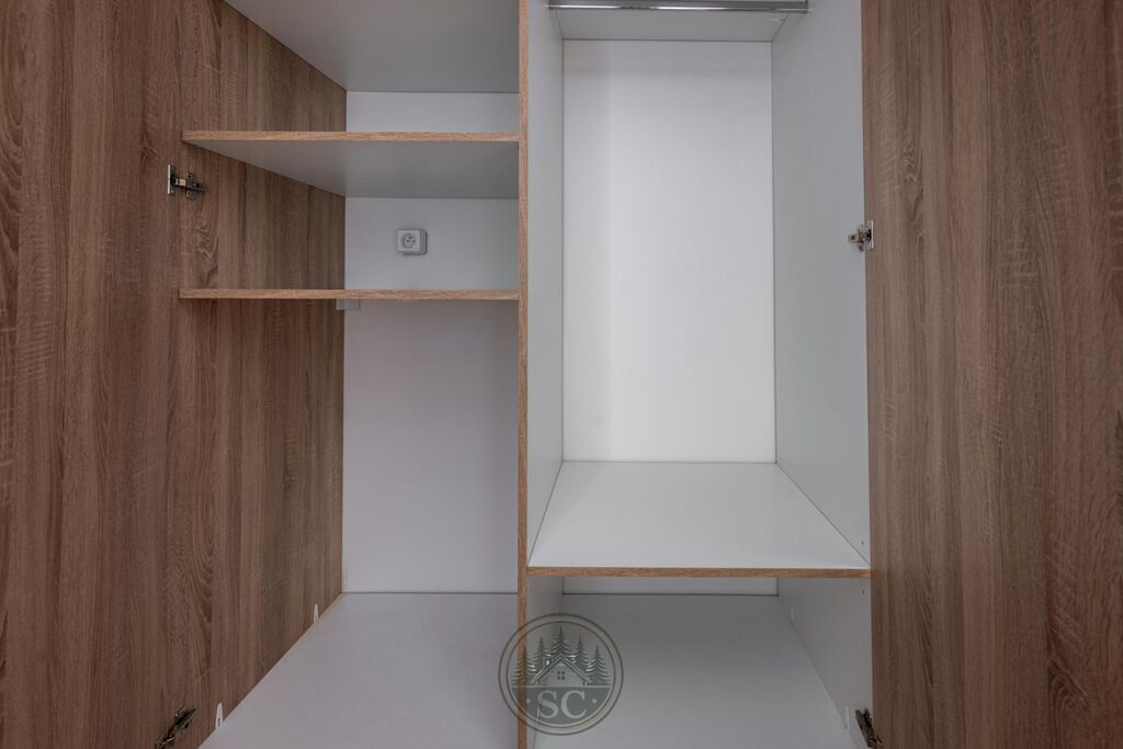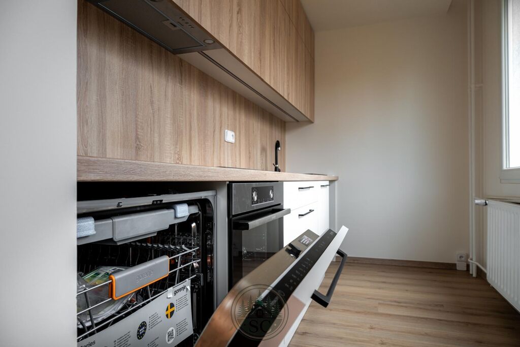 Kuchyňská linka i vestavná skříň jsou na míru od truhláře - kvalitní zpracování, přírodní odstíny a moderní linie dávají bytu příjemný a harmonický charakter. V kuchyni najdete zcela nové spotřebiče Gorenje  - myčku, troubu a varnou desku, a také připravený prostor pro pračku.