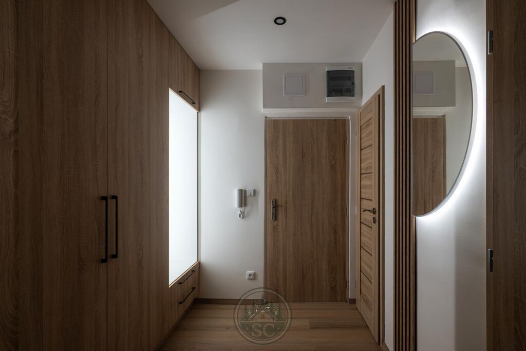 V předsíni vás zaujme osvětlená vestavná skříň, bodová světla a zrcadlo s podsvícením, která dávají prostoru moderní, ale stále příjemnou atmosféru.