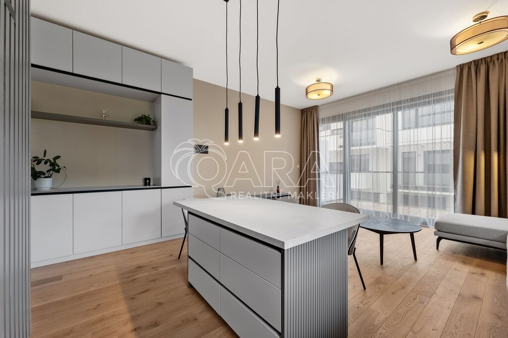 Interiér navržený designérkou na míru vyniká promyšleným uspořádáním, nadčasovým stylem a vysokou kvalitou zpracování. Dominantou bytu je prostorný obývací pokoj s kuchyní, jídelním koutem a přímým vstupem na balkon s výhledem do zeleně. Kuchyňský kout je zařízen veškerými spotřebiči značky AEG (myčka na nádobí, lednice, mrazák, trouba, indukce, digestoř, mikrovlnná trouba). Interiér je vybaven nábytkem z dílny Hanák, vyrobeným v nejvyšším standardu kvality. Precizní zpracování, prvotřídní materiály a elegantní design podtrhují exkluzivní charakter prostoru.