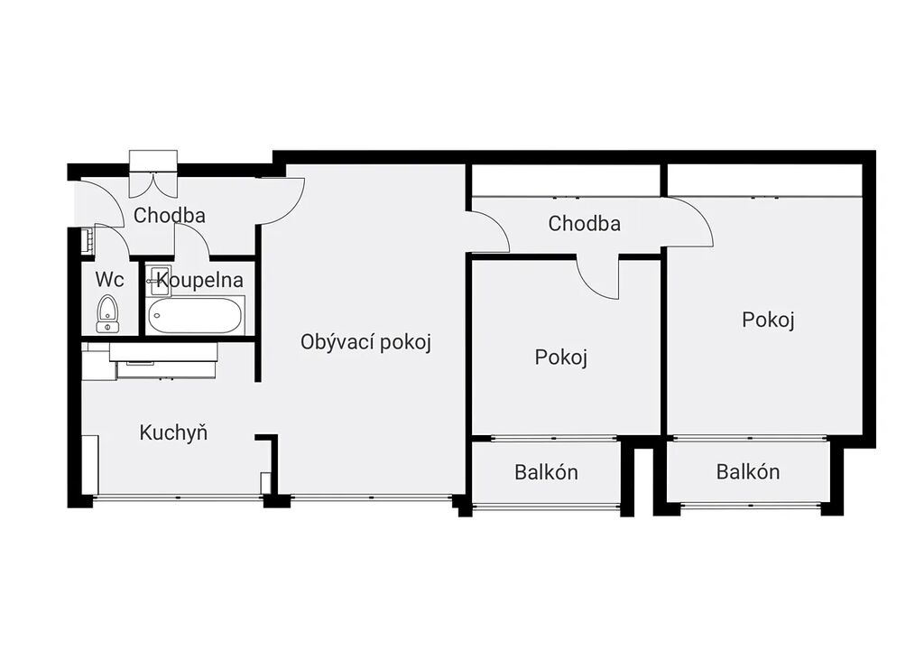Byt je dispozičně řešen s neprůchozími pokoji, což zajišťuje větší soukromí a praktičnost. Dispozice bytu zahrnuje: