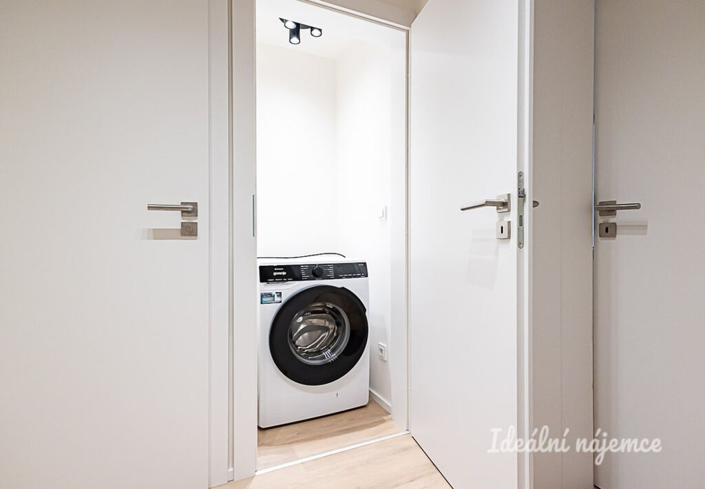 Byt je částečně vybavený, což dává novému nájemníkovi možnost doladit interiér podle vlastního vkusu. Kuchyňský kout je vybaven elektrickou a mikrovlnnou troubou, indukční varnou deskou, lednicí, digestoří, myčkou a posezením. Obytná část nabízí pohodlný gauč, konferenční stolek, přímý vstup na balkon a úložné prostory. Koupelna je zařízena sprchovým koutem, umyvadlem a toaletou. V bytě se také nachází komora s pračkou.