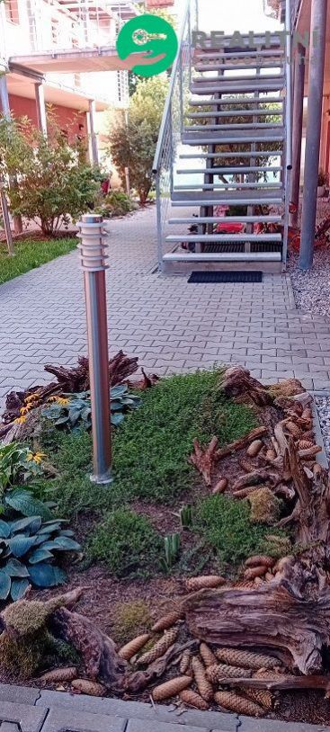 Byt je součástí dvou domků, které vytvářejí útulný dvorek. Cestička lemovaná okrasnými keři vás zavede k blankytnému bazénu. Vedle něj najdete houpačky, klouzačku, pískoviště, trampolínu i pergolu se zahradním posezením, grilem a lednicí  ideální místo pro sousedská setkání.