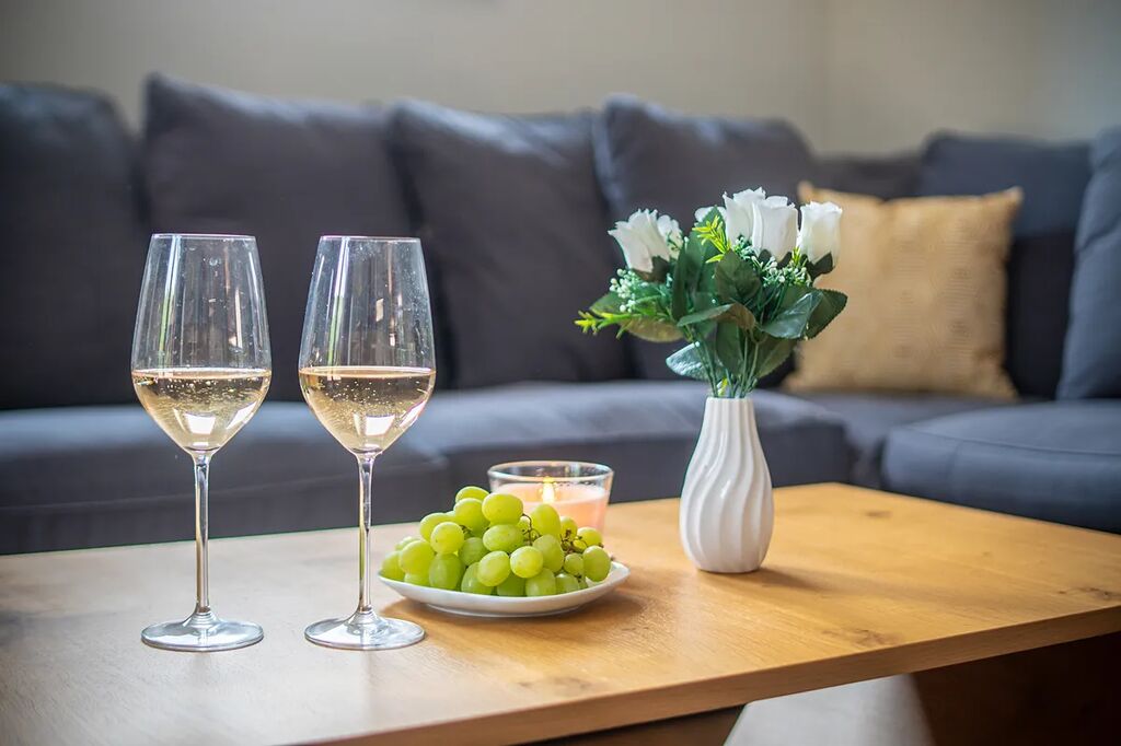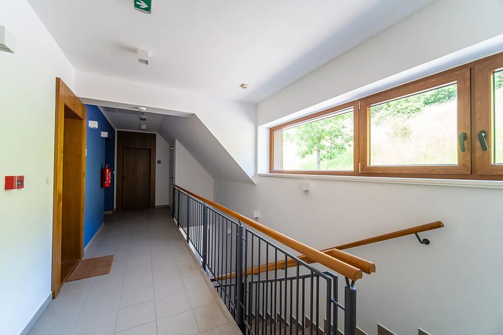 Do apartmánu vejdeme prostornou chodbou (6,5 m2). Dominantu apartmánu tvoří světlý obývací pokoj s kuchyní (22,4 m2) s překrásnými výhledy do okolí. Z obývacího pokoje se vstoupí na balkon(7m2), kde si můžete užít snídani, kávičku či relaxovat.