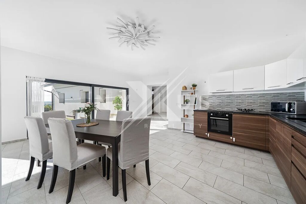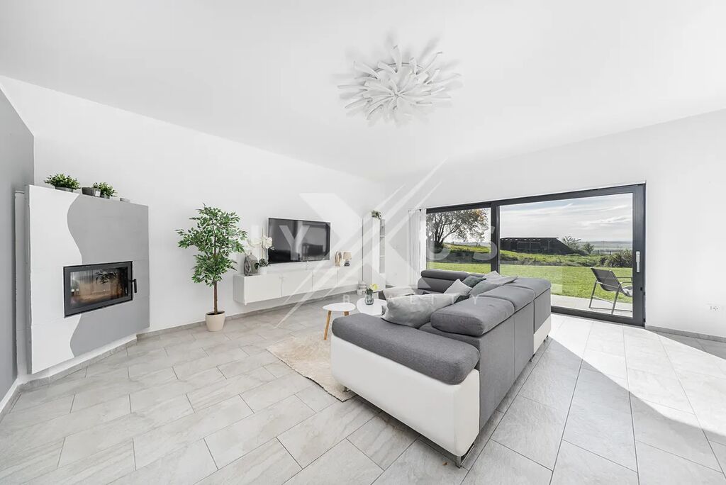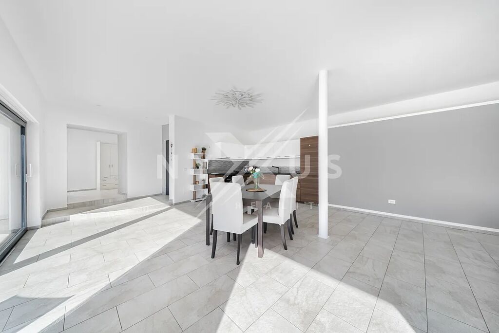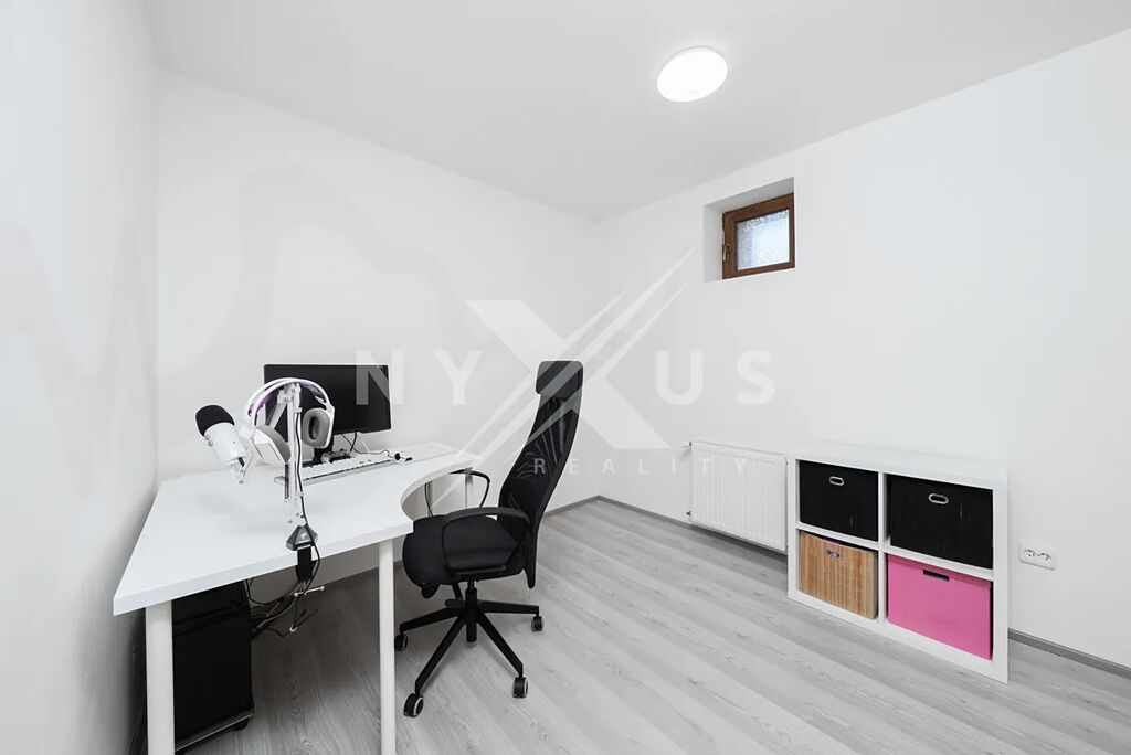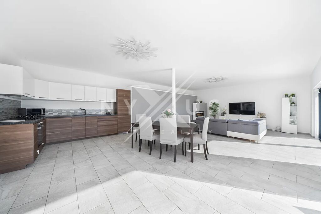 Už při vstupu zaujme velký a světlý obývací pokoj, který přirozeně navazuje na terasu a zahradu. Je to místo, kde se budete rádi scházet s rodinou i přáteli, ať už v zimě u krbu, nebo v létě s otevřenými dveřmi na terasu. Kuchyň s jídelní částí tvoří přirozené centrum celého domu a poskytuje dostatek prostoru pro každodenní vaření i společné večeře.