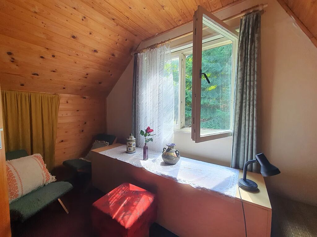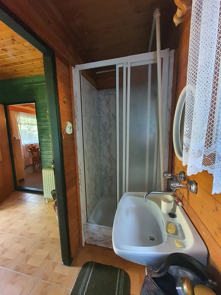 Vstupní veranda, šatna, obývací pokoj s kuchyňským koutem, ložnice, koupelna se sprchovým koutem a WC. Dále samostatná technická místnost, využívána jako dílna a kotelna, se samostatným vchodem.