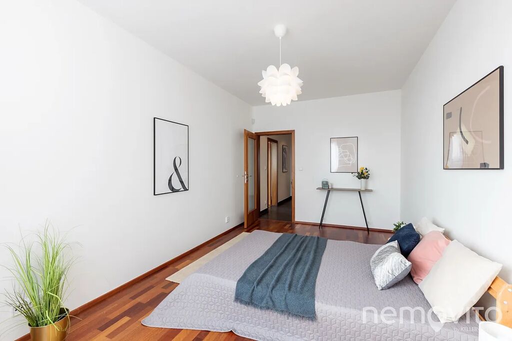 Ložnice jsou na opačných stranách bytu a jejich plocha je 17 a 12 m2. Nejsou tedy v kontaktu a jsou rozdělené prostornou chodbou, na které je samostatné WC s umyvadlem a koupelna s vanou. Naproti ní je pak ještě komora nebo šatna (4 m2). Chodba o velikosti 8 m2 umožňuje umístění dalších skříní, nicméně dostatek úložného prostoru řeší velký sklep. Ten je prakticky umístěný hnedka u dvojice stání, která k bytu náleží.