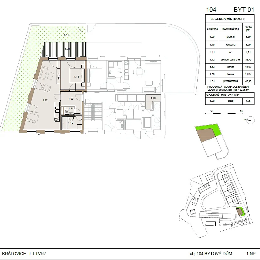 Ve výhradním zastoupení vlastníka nemovitosti vám nabízím k dlouhodobému pronájmu nový a moderní byt s terasou a vlastní předzahrádkou o ploše 45.18 m2, který se nachází v 1. nadzemním podlaží novostavby rezidenčního bytového domu v areálu projektu Nové Královice. Byt je vybaven kuchyňskou linkou se sklokeramickou indukční deskou a el. troubou, digestoří, lednicí s mrazákem, myčkou nádobí a mikrovlnnou troubou. Byly zde použity výlučně velmi kvalitní materiály a provedení je opravdu precizní. Dřevěné podlahy, velkoformátová dlažba, hliníková okna s izolačními trojskly, předokenní žaluzie atd. K bytu dále náleží sklep a vlastní parkovací stání u domu - zahrnuto v ceně. Projekt se nachází v městské části Praha-Královice, která si zachovala původní vesnický ráz. Obec tak představuje klidnější a čistší variantu městského života. Přímo v Královicích naleznete množství sportovního vyžití i možností pro trávení volného času: tenisové kurty, fotbalové hřiště, přírodní park v údolí Rokytky, přírodní koupaliště Markéta, turistickou trasu i síť cyklostezek napojených na trasy č. 1 a A24 vedoucí do Prahy, trasu A440 vedoucí do Běchovic a trasu 8100, tzv. Pražské kolo. Součástí plánu je i rekonstrukce historické Tvrze, která je dominantou celého projektu. Vzhledem k nesporné hodnotě nemovitosti požaduje pronajímatel vratnou kauci ve výši 50.000 Kč, odměna RK 1 nájemné + DPH. Jestliže hledáte lokalitu zrozenou k nalezení klidu, ale zároveň v místě plné občanské vybavenosti, jste v Královicích správně.