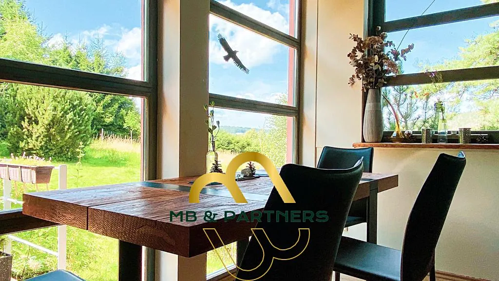Dům má 3 oddělené obytné místnosti. Hlavní obytný prostor s krbem, kuchyňským koutem a galerií v mezonetovém stylu a tvoří srdce domu. Tento prostor umožňuje přímý vstup přes dřevěnou dubovou terasu do rozlehlé zahrady se vzrostlými stromy a keři. Díky prosklené stěně nabízí neuvěřitelné výhledy celoročně. Terasa domu je zastřešena elektricky ovládanou markýzou.
