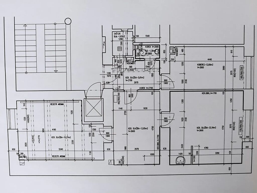 místnost s oknem do dvora o velikosti 19,27m2; místnost s umyvadlem s oknem do ulice Myslbekova o velikosti 22,16m2. V nebytovém prostoru se nachází vstupní chodbička, která je společná pro nájemce jednotlivých místností. Místnosti jsou s uzamykatelnými dveřmi a topnými tělesy, vytápění a ohřev vody zajišťuje plynová kotelna v domě. Jedná se o tichý dům.