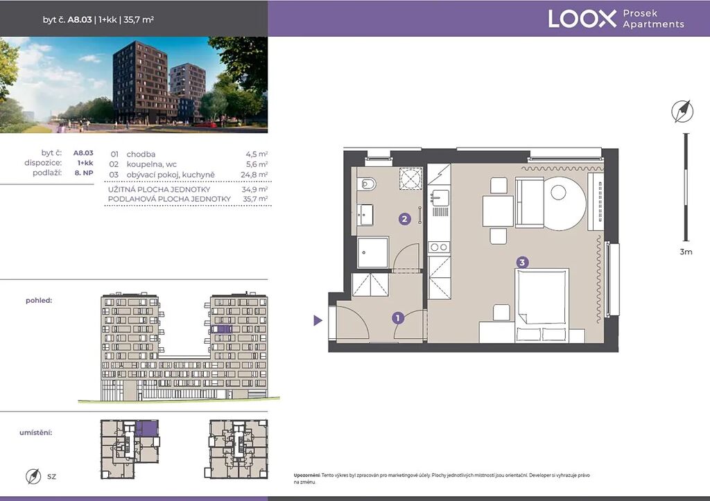Nabízíme k pronájmu kompletně vybavený byt o dispozici 1+KK s výměrou 36 m2 v 8.NP v 11patrovém bytovém domě LOOX přímo u metra Prosek.