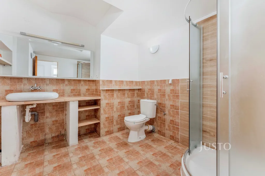 V prostorné koupelně je umyvadlo, WC a sprchový kout.