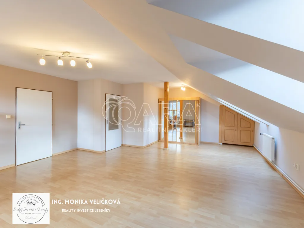 V klidné části Železná – Vrbno pod Pradědem, přímo u lesa a na svahu, nabízím prostorný podkrovní apartmán o dispozici 4+1 a celkové ploše 135 m². Ideální jak pro rodinné bydlení, tak pro rekreaci či investici na pronájem.