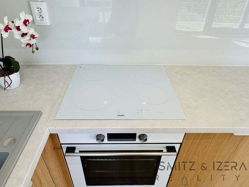 Dispozici bytu tvoří jeden prostorný pokoj, který je chytře rozdělen příčkou na obytný a spací prostor. Byt se nachází v 1. patře domu, přístupný po samostatném schodišti přes lodžii. Zahrada u domu poskytnutá pro tento byt má plochu 60 m2. Byt má orientaci oken na jih. Ve slunném obývacím pokoji s výstupem na lodžii je umístěna nádherná kuchyňská linka plně zařízená spotřebiči. Moderní koupelna o velikosti 4 m2 je vybavena sprchou. V koupelně je i prostor na pračku a sušičku. K dispozici je technická místnost. Byt je nezařízený.