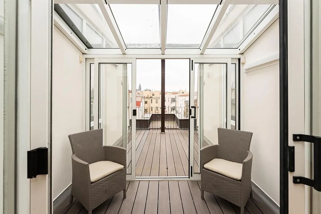 Luxusní prostorný mezonet s terasou a zimní zahradou,  5+kk (4 ložnice, 3 koupelny) o celkové rozloze 248 m2 je situovaný v 6. a 7. patře rezidenčního domu s výtahem.  Byt nabízí obývací pokoj  s plně vybavenou kuchyní (sporák/trouba, lednice, myčka) oddělenou skleněnou příčkou, 4 ložnice situované do klidné zóny vnitrobloku, 3 koupelny (sprcha, vana, bidet), 2x šatnu, komoru a prádelnu. Byt je vybaven nábytkem. Terasa a zimní zahrada jsou situované na jižní stranu. Nádherný výhled na Hradčany. SAT, telefonní linka a internet.