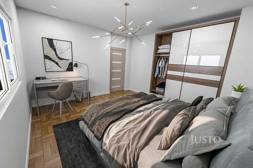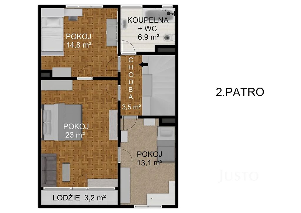 2. patro: obývací pokoj, dva pokoje, koupelna se sprchovým koutem, balkon do ulice, 59,1 m²