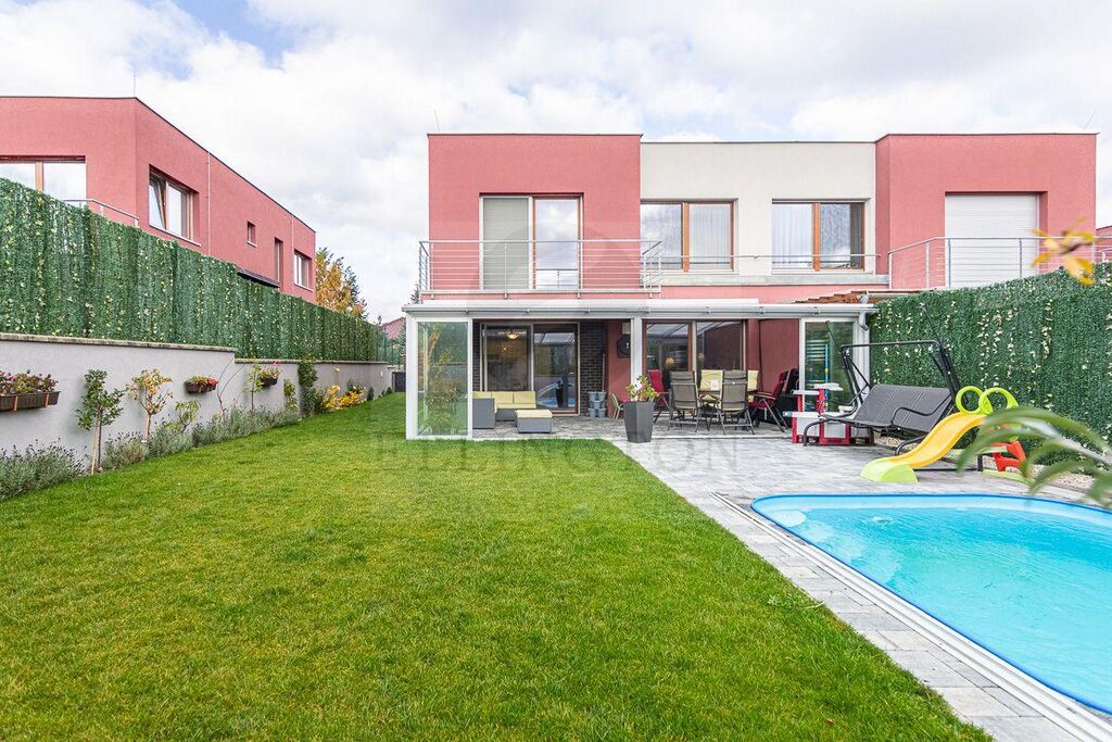 Nabízíme prodej rodinného domu 5+kk na Praze- západ město Roztoky, které se pyšní nejen krásnou přírodní rezervací Tiché údolí, ale i také kompletní občanskou vybaveností včetně škol a školek a přesto kousek od Prahy. Jedná se o novostavbu 5+kk s garáží kolaudovanou v roce 2018 o celkové rozloze 162m2 na pozemku 381m2. V přízemí domu se nachází zádveří z kterého se vchází do šatny z vest. skříní také samostatná toaleta , technická místnost, infra sauna se sprchovým koutem, která je umístěna v garáži. Dále se vchází do obývacího pokoje s přípravou na krb a plně vybavenou kuchyní spojují s terasou a soukromou zahradou s velkoformátovými okny. Patra spojují masivní dřevěné schodiště se stejném stylu jako jsou parapety a zárubně dveří. V první podlaží se nachází 4 ložnice, z nichž dvě mají vlastní vstup na terasu s výhledem do zahrady. V celém domě byli použity nadstandardní prvky včetně sanity, kompletně zařízený kvalitním nábytkem na míru (lze prodávat i nezařízený). Soukromí horního podlaží doplňuje koupelna s vyhřívanou podlahou (toaleta, vana, sprchový kout) a samostatná toaleta, vše vybaveno sanita Grohe. V přízemí je položena luxusní dlažba Marazzi, v celém domě jsou sádrové omítky, podhledy a všechna okna disponují venkovními žaluziemi na ovládání a sítěmi proti hmyzu. Vytápění domu je řešeno plynovým kotlem Protherm a podlahovými konvektory v kombinaci s s radiátory. Garáž a vstupní brána jsou na dálkové ovládání a bezpečnost celého domu zajišťuje alarm. Zahradní bazén se slanou vodou (4x3 m) a protiproudem na automatické ovládání doplňuje zastřešená terasa, hliníková pergola s plisé roletkami, trávníkový koberec s automatickým zavlažováním a zahradní domek. Velmi pěkné bydlení které vnese do života soukromí a výjimečný komfort. Možnost hradit i hypotečním úvěrem s kterým vám i velice rádi pomůžeme. Vzhledem k lokalitě tuto nabídku doporučujeme. Nutno vidět.