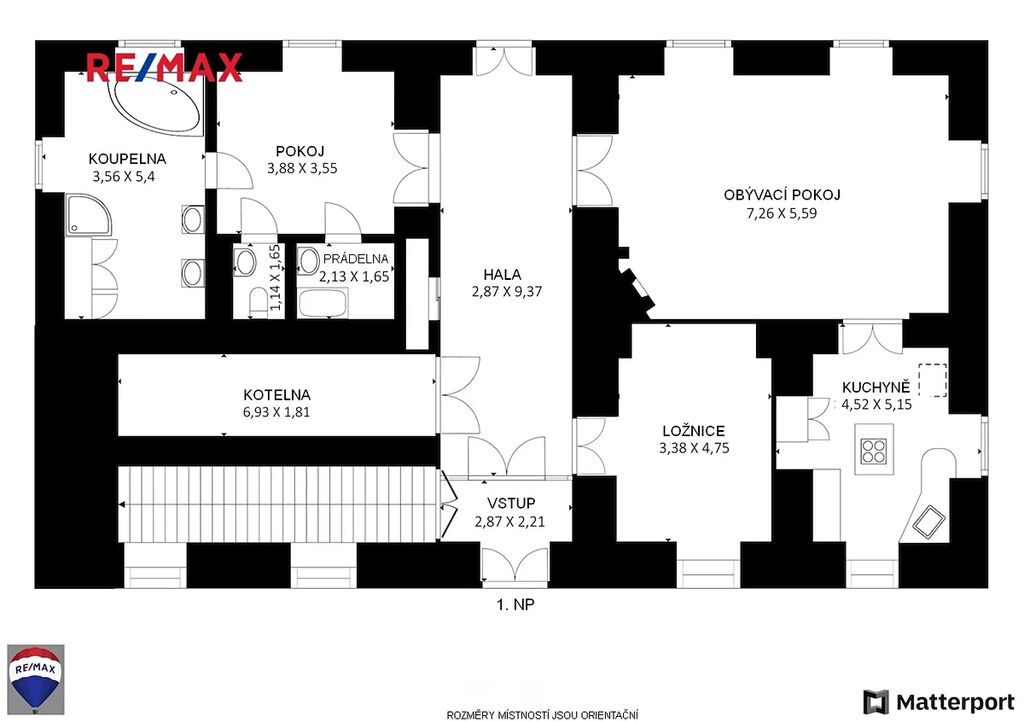 Chodba cca 31,99 m², obývací pokoj cca 41,25 m², kuchyně cca 16,38 m², ložnice cca 14,82 m², schodiště cca 9,22 m², kotelna cca 14,99 m², spíž cca 4,87 m², koupelna cca 15,39 m², pracovna cca 15,58 m², WC cca 1,96 m², prádelna cca 3,96 m².