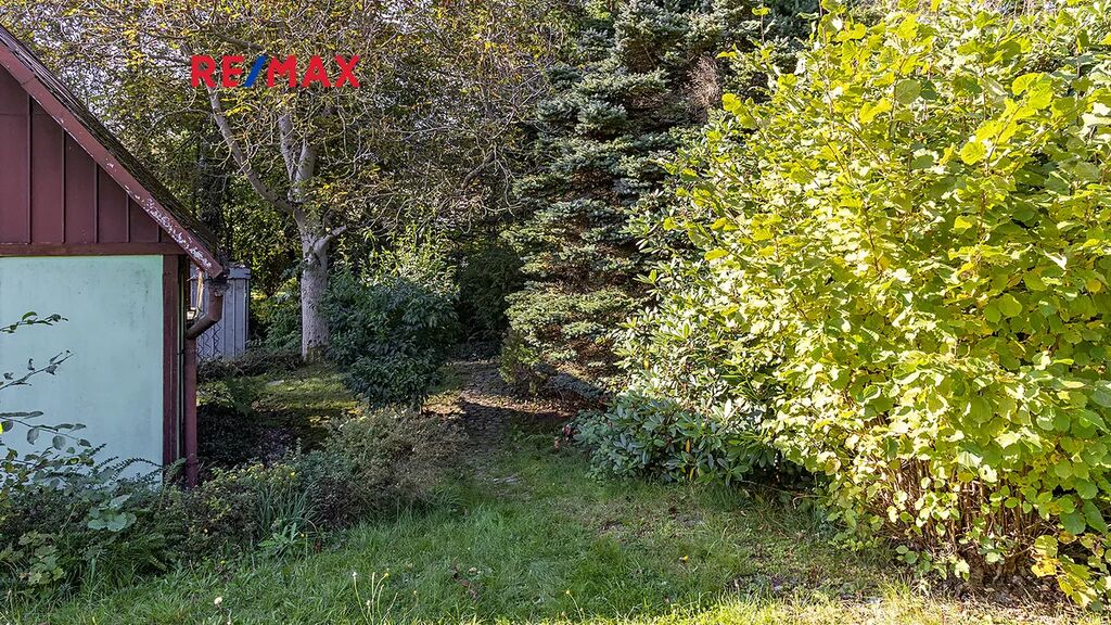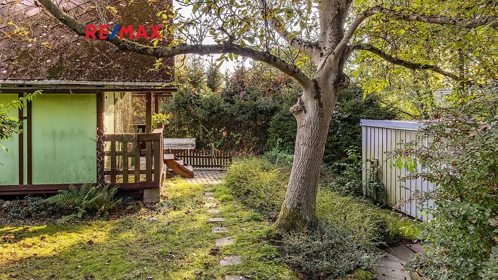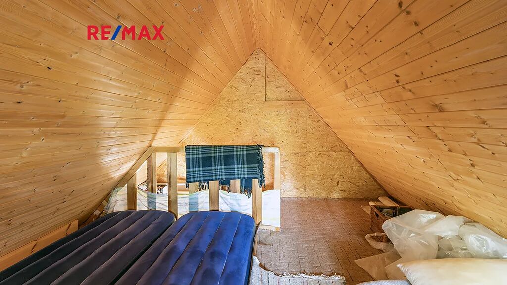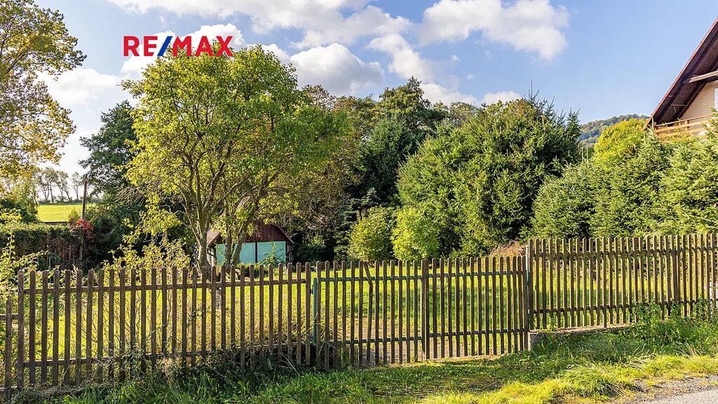 Na pozemku resp. v jeho zadní části v tuto chvíli stojí jednoduchá dřevěná chata (nikoliv na místě předpokládané budoucí stavby RD), která může ještě dál sloužit k občasnému rekreačnímu nebo sezónnímu využití, ale hlavně vám poskytne praktické zázemí během samotné výstavby domu – místo na nářadí, přístřešek při špatném počasí, zázemí pro dohled na stavbu apod.