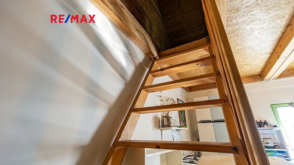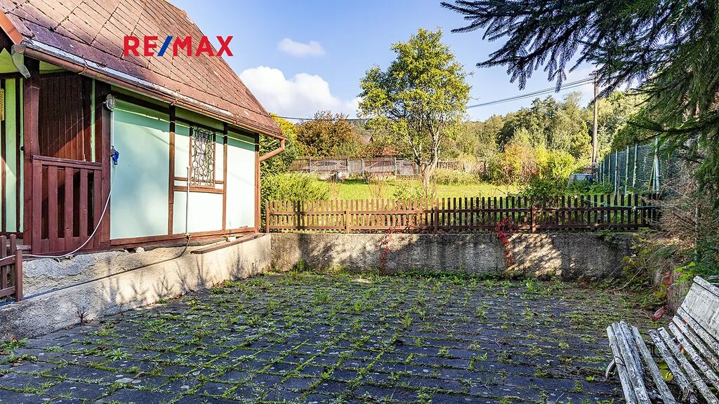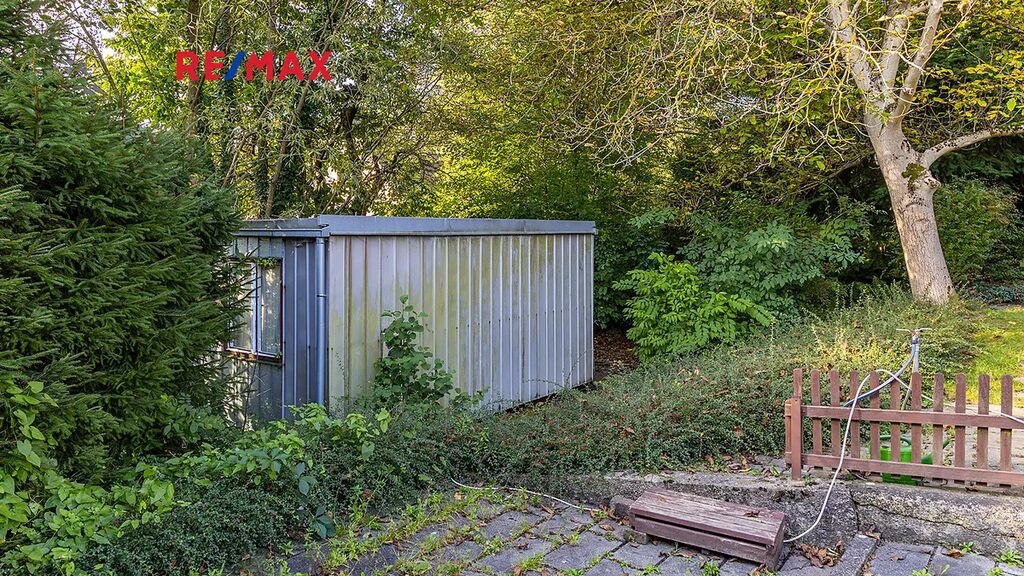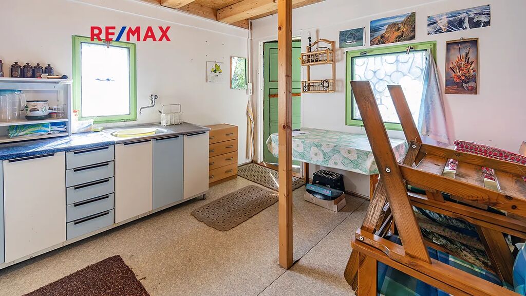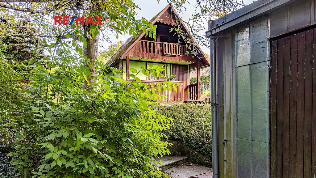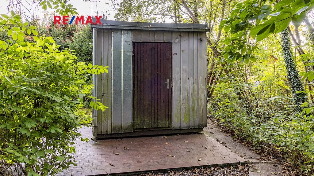 Důležité upozornění: tato chata není zapsaná v katastru nemovitostí jako stavba. To znamená, že ji vnímáme spíše jako dočasný objekt (provizorní zázemí), nikoliv jako plnohodnotnou rekreační stavbu. Na okraji pozemku je dále umístěn kontejner sloužící jako sklad. Ideální na materiál, nářadí, zahradní techniku atd. V praxi to znamená, že když začnete stavět, nemusíte první den řešit, kam s věcmi. Máte to připravené.